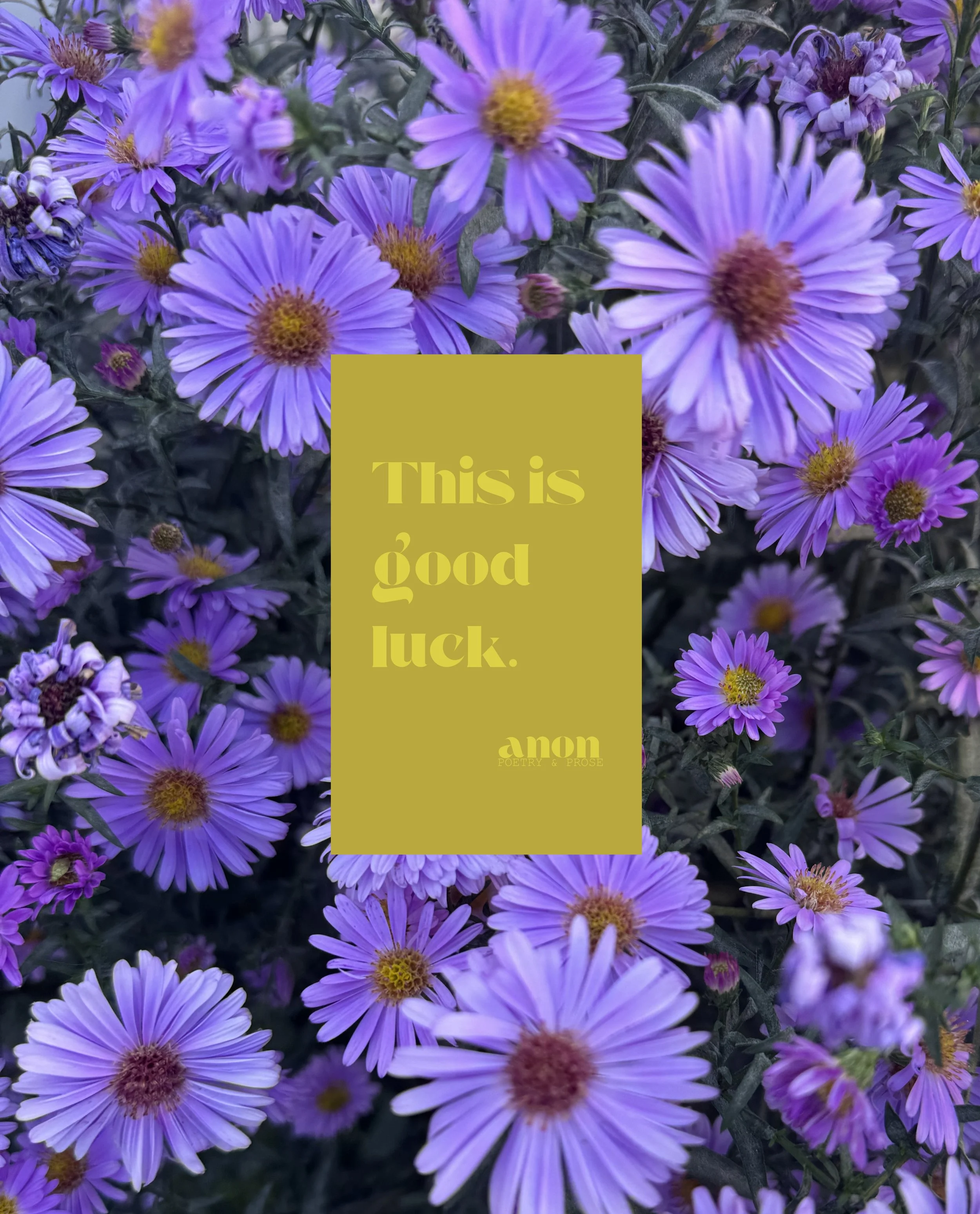 This is good luck. brings readers on a reflective journey through anon’s early formative experiences and the reverberation of these experiences throughout her life. It touches on themes of betrayal, review, and reckoning.